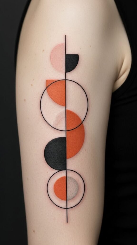 Placed along the collarbone, forearm, or ribcage, this design uses interlocking triangles, offset circles, and a single broken line to symbolize the tension between connection and self-reliance; the triangles point inward and outward to show moments of inward reflection and outward movement, while the broken line represents healed fractures and resilience. Its minimalist execution keeps the emotional weight understated—ideal for someone who wants a personal emblem of independence and self-love that reads as elegant geometry from a distance and intimate narrative up close.