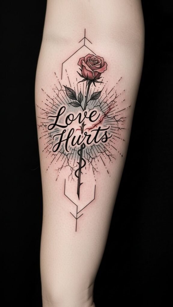 The wilted rose and thorn-wrapped script symbolize the coexistence of beauty and pain inherent in love; muted watercolor tones evoke faded memories while the crack-like healed scars suggest resilience and recovery.