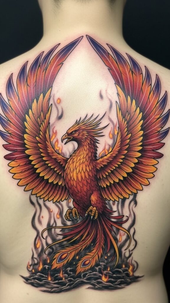 This design places a mid-sized phoenix rising from stylized ash and ember swirls, wings unfolding into a cascade of vibrant reds, oranges, and golds with subtle teal highlights; fine-line feather details, soft watercolor splashes, and delicate filigree around the tail create movement and intricacy.