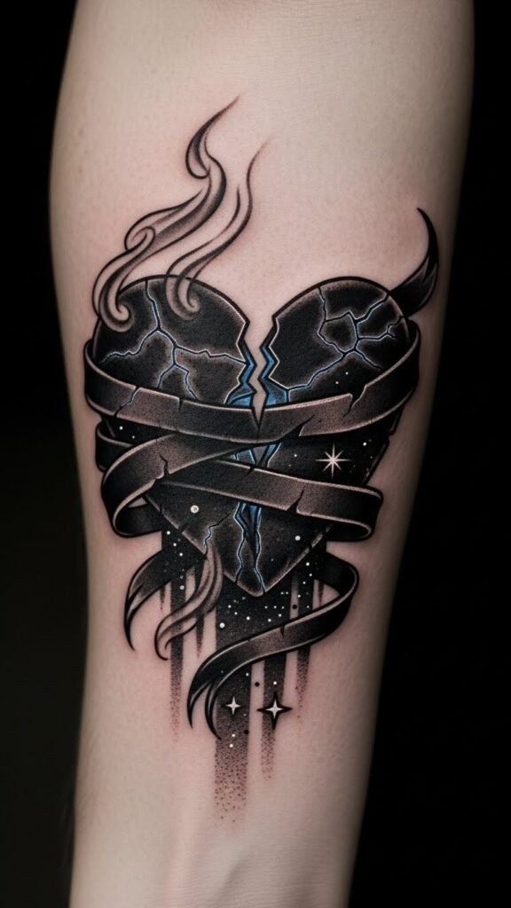 These tattoos can encapsulate your journey, marking the beauty in your pain and celebrating the strength of your self-empowerment. The fractured heart wrapped in torn black ribbon symbolizes rupture and protective armor—its cracks let the inner cosmos spill out, representing hope and inner life emerging from hurt.