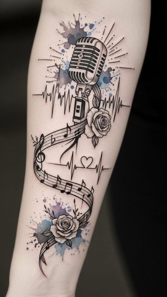 This design symbolizes the voice and rhythm of personal history: the microphone represents self-expression, the notes-to-heartbeat transition signifies how songs mirror emotional highs and lows, roses add remembrance and tenderness, and watercolor hues evoke the mood of specific tracks; ideal placement along the forearm or ribcage allows the piece to flow with the body’s movement and be shown or concealed as chosen.