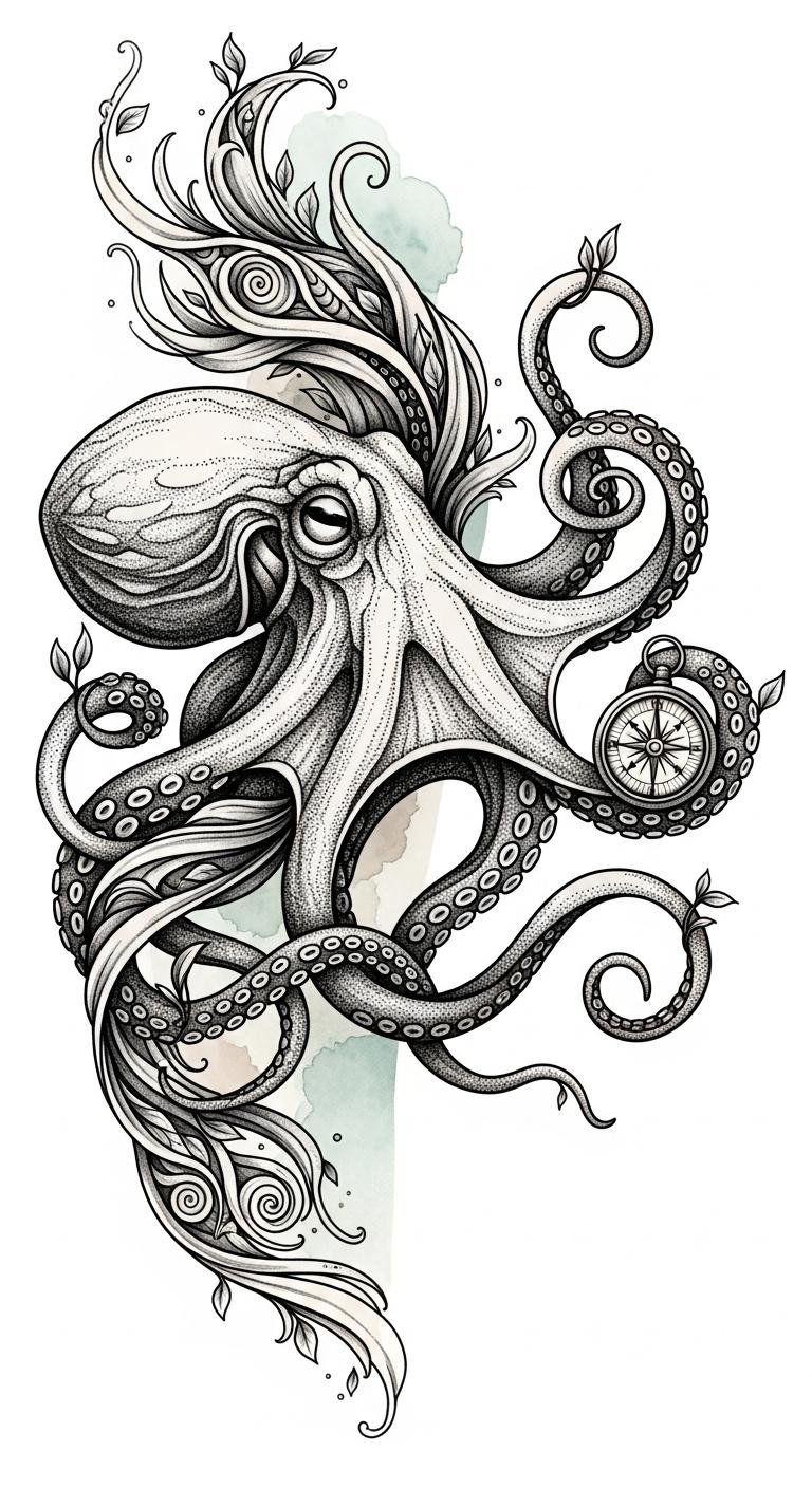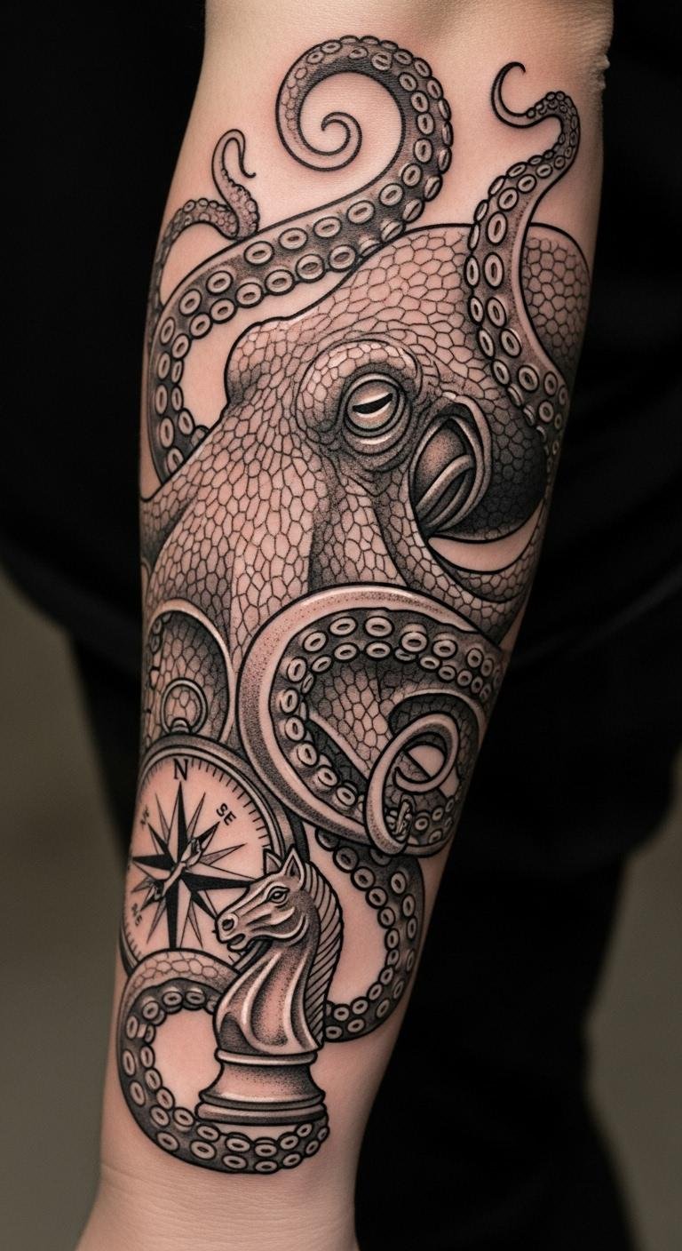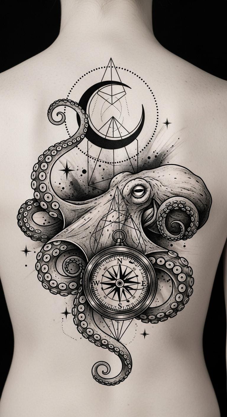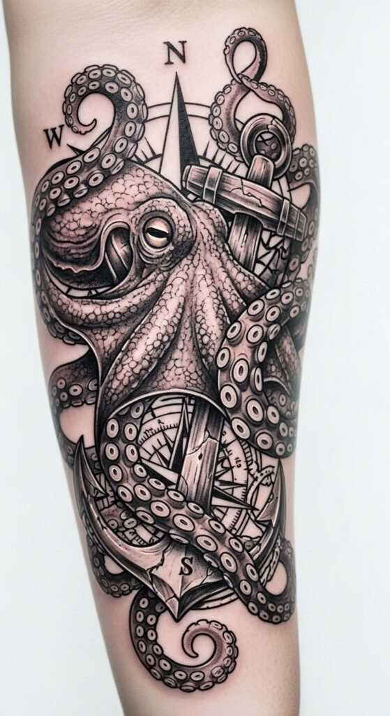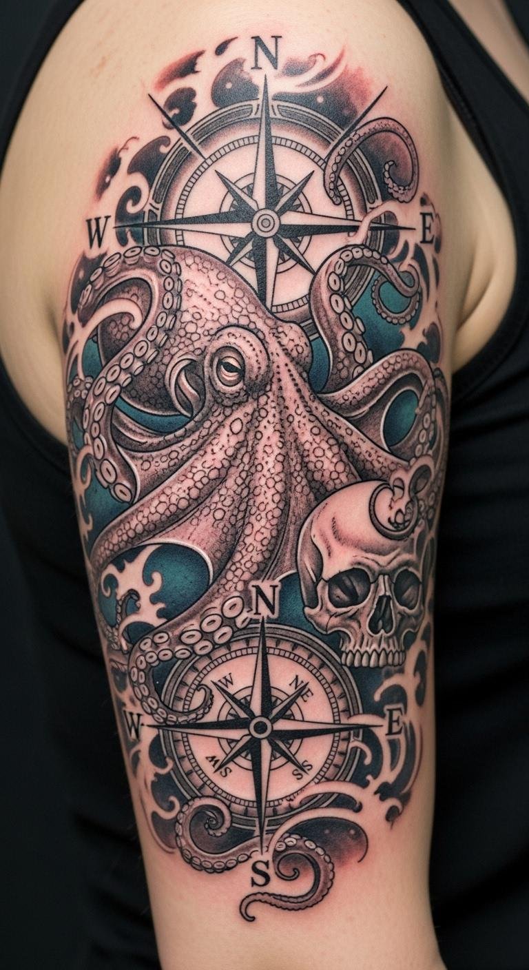 This design places a detailed octopus as the central figure, its curling tentacles wrapping around an antique compass and a weathered skull, inked in rich blacks and deep blues with fine linework and soft shading to suggest movement and depth; ideal placements are the upper arm, chest, or back where the tentacles can flow naturally and the compass can align with the body’s centerline, conveying resilience, guidance through life’s journeys, and an emotional balance between curiosity for the unknown and acceptance of mortality.