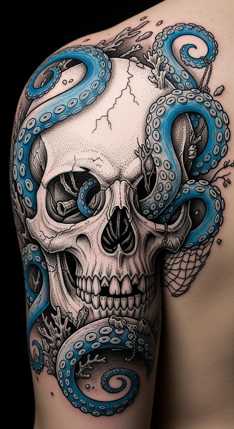 Blending the stark imagery of mortality with the fluid grace of the octopus evokes themes of resilience and transformation; this tattoo concept pairs a hyper-realistic octopus rendered in detailed black and gray with subtle white highlights, its tentacles weaving through and around a faint anatomical skull, seaweed, and scattered barnacles to suggest both fragility and persistence.