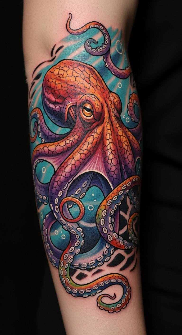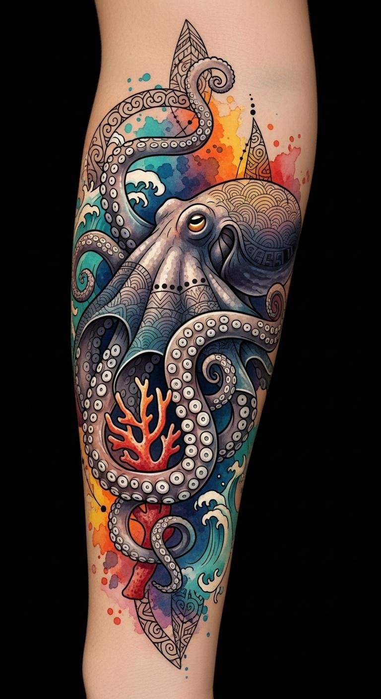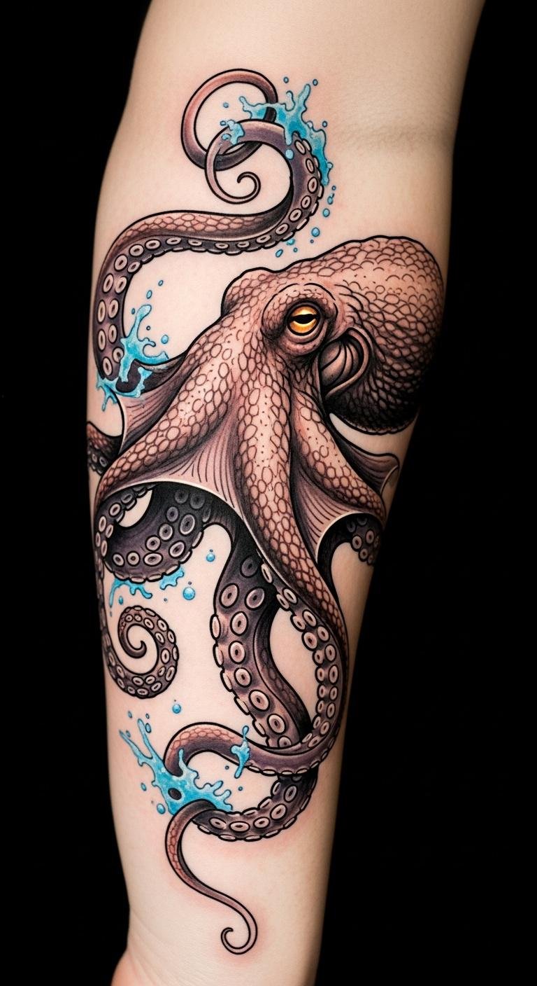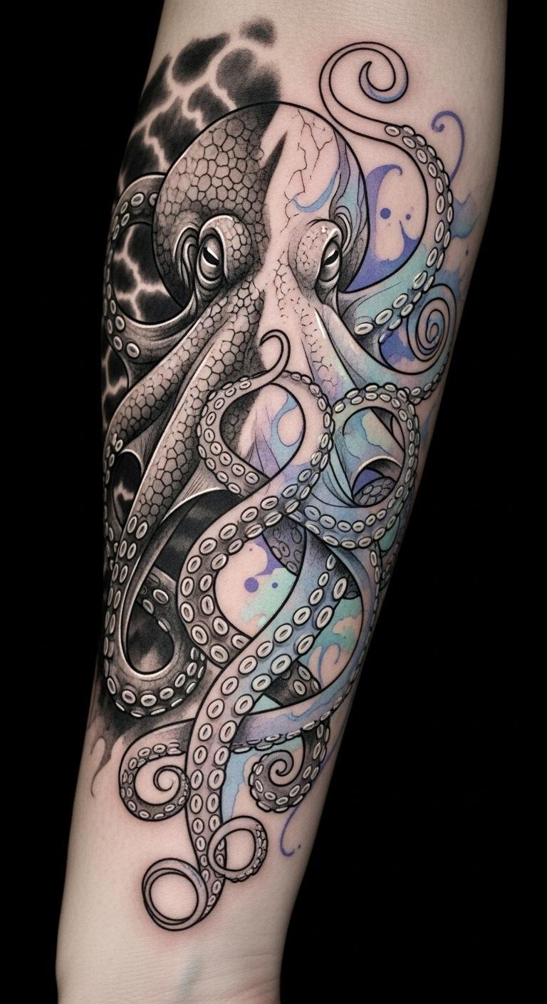 The design evokes adaptability and intelligence through the octopus’s sinuous form, with colors suggesting emotional depth and warmth; placement along the forearm or side ribs lets the tentacles flow with body movement, creating an intimate, expressive statement that balances cultural motifs and personal narrative.