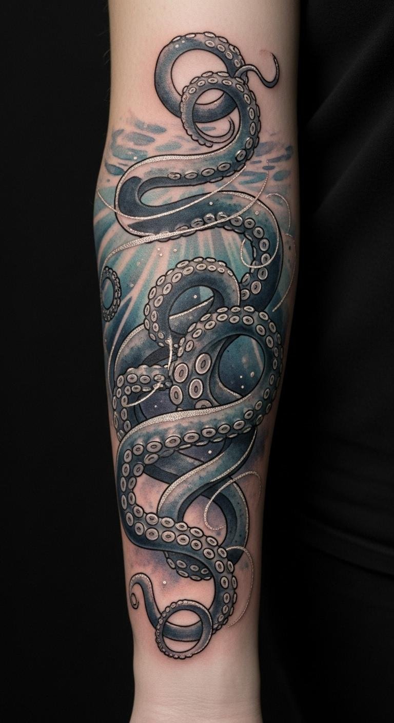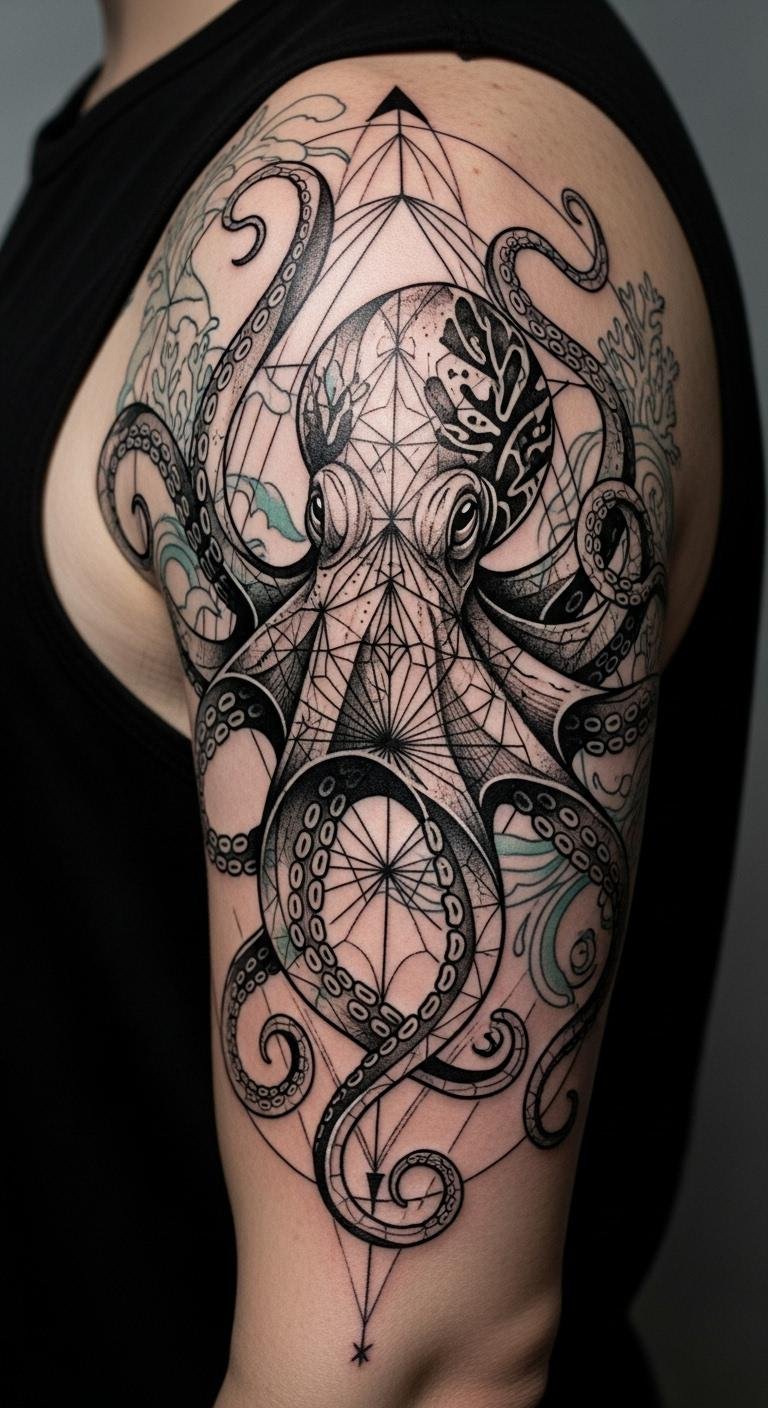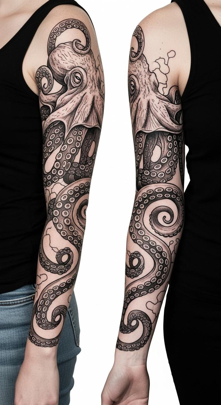 Placed as a full sleeve wrapping from shoulder to wrist, the design centers on a large octopus whose arms spiral organically around the arm’s muscle contours, interweaving with negative space and delicate linework so the piece reads both up close and from a distance.