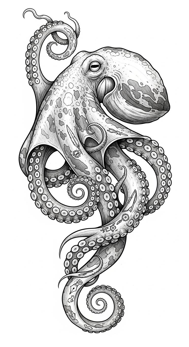 Emotionally it evokes curiosity, resilience, and a playful defiance, suitable for personal storytelling. Ideal placements are the forearm or shoulder where the tentacles can wrap and flow naturally with muscle lines, or scaled up for a back piece to emphasize expansive movement and visual impact.