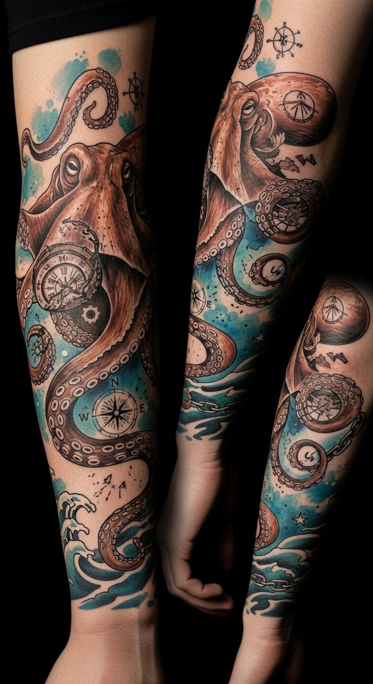 Place this design spiraling around the forearm so the tentacles flow with muscle contours, with the compass and clock near the wrist for guidance and time, and the broken chain and watercolor accents near the elbow to emphasize liberation and emotional depth; the imagery evokes strength, adaptability, and the layered emotional history of the wearer.