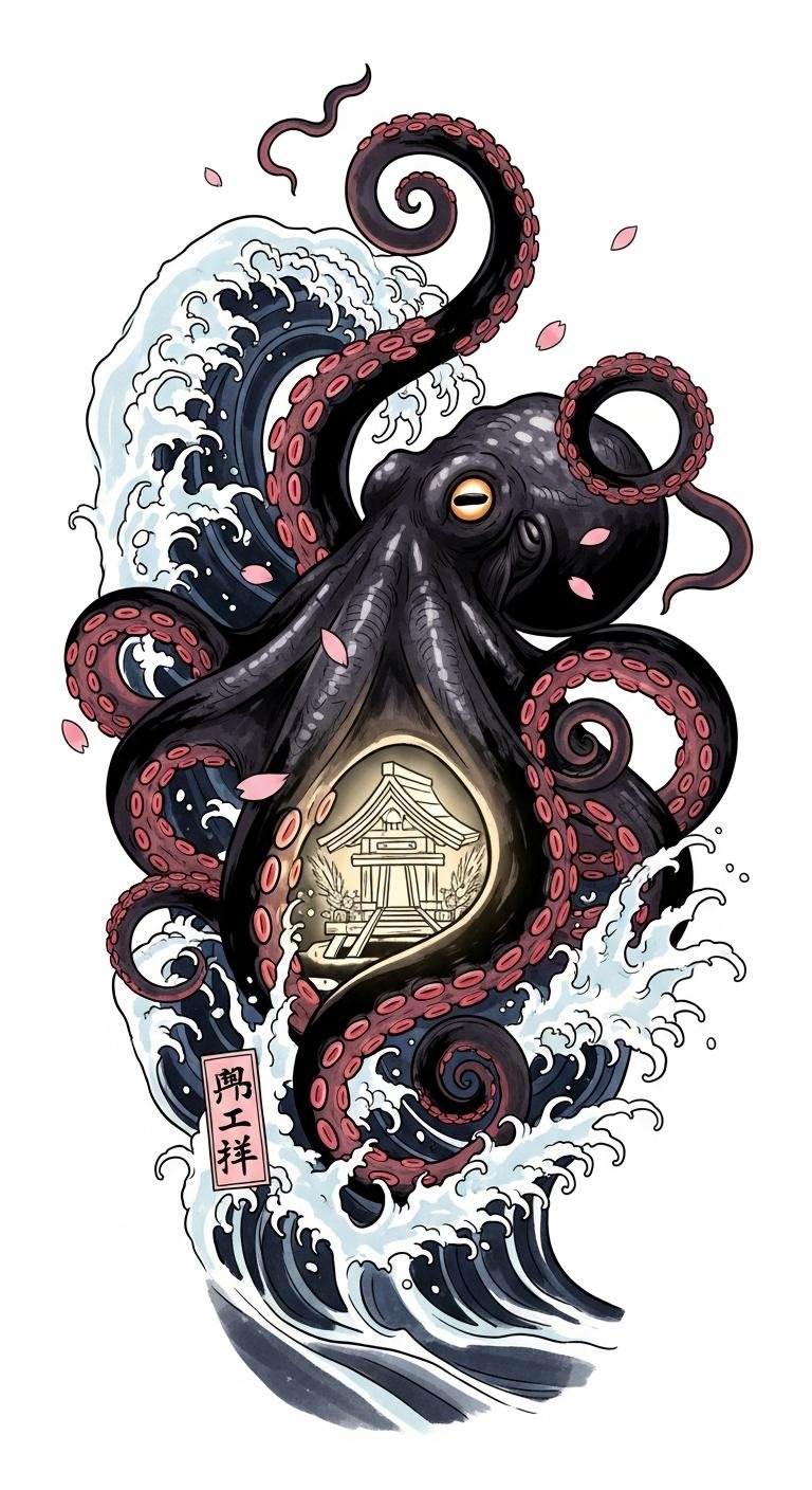 The design channels those themes: the octopus enfolding the shrine evokes guardianship and resilience, the sumi-e style and indigo palette convey solemnity and tradition, crimson accents add vitality and defiance, sakura petals introduce transience and hope.