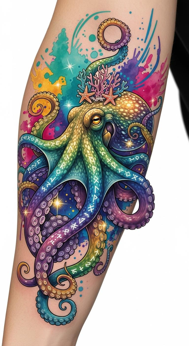This design symbolizes transformation, intelligence, and fluid adaptability; the bright colors and whimsical elements evoke wonder and playful mystery, making the wearer feel connected to creativity and the unseen depths. Emotionally it reads as bold and expressive—ideal for someone who wants a statement piece that balances fantasy with natural grace. Placement works well on broad canvases like the upper arm, shoulder blade, or thigh, where flowing tentacles and intricate patterns can wrap and move with the body, enhancing the sense of motion and life.