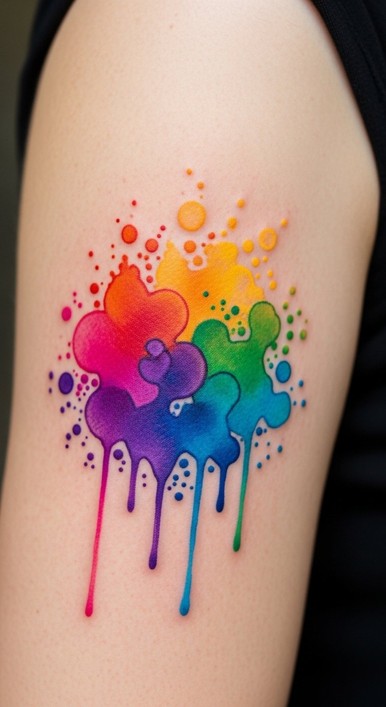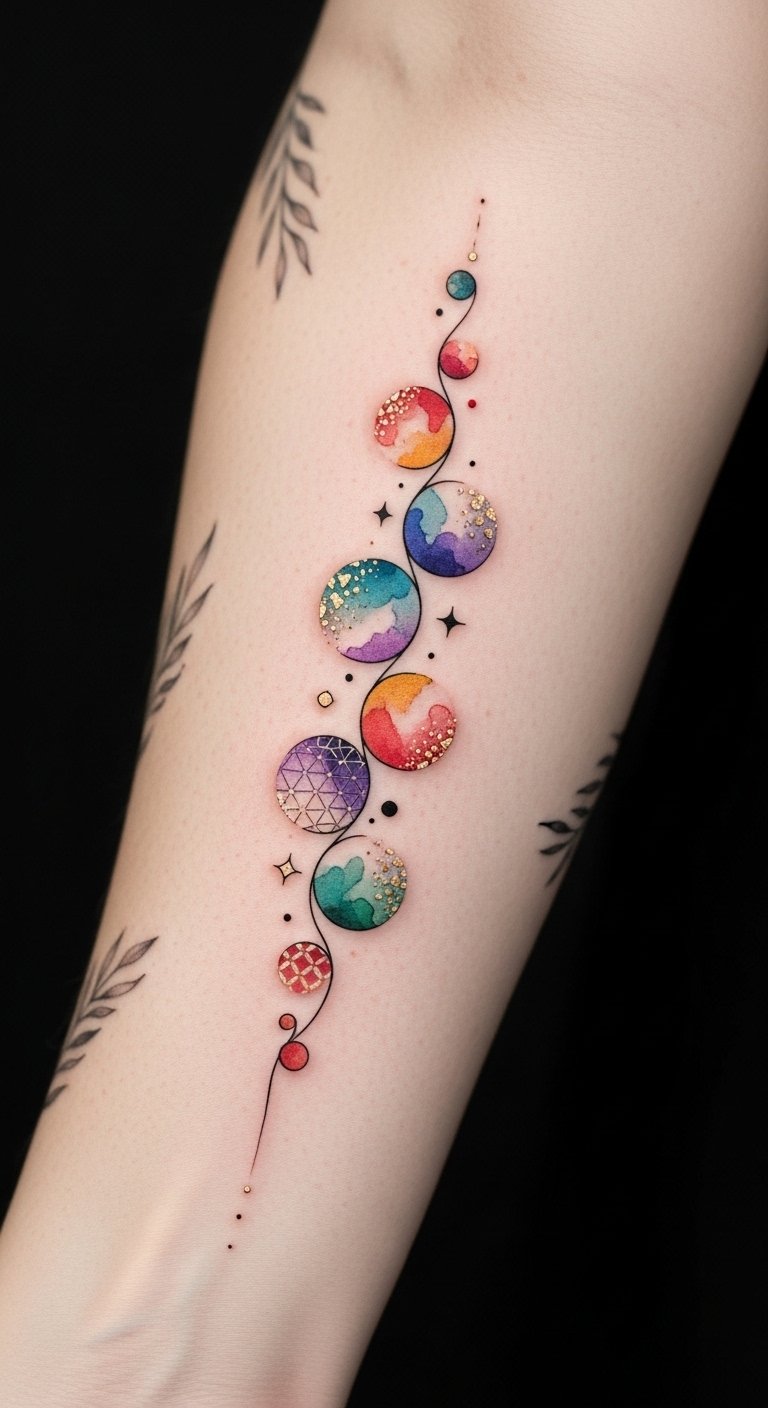 A cluster of multicolored watercolor dots arranged in an organic crescent that flows with the body’s natural lines—ideal for forearm, shoulder blade, or along the ribcage—symbolizes moments of joy, creativity, and personal milestones; the playful spectrum evokes freedom and spontaneity while the expert technique and soft edges express vulnerability and the blending of experiences into a cohesive identity.