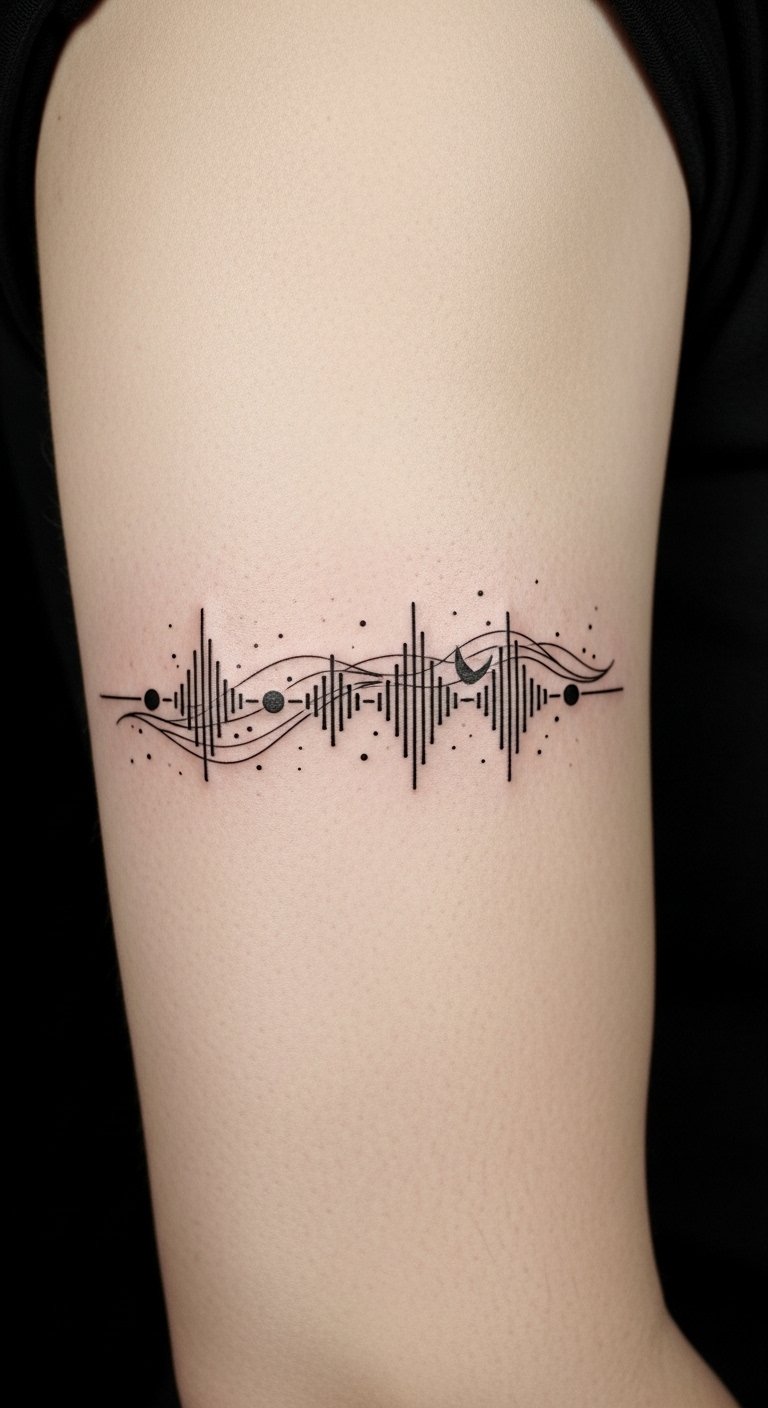 Ideal placements are along the forearm, ribcage, or shoulder blade where the curved flow can follow the body’s lines, allowing the dots to feel as if they’re drifting with movement and breath.