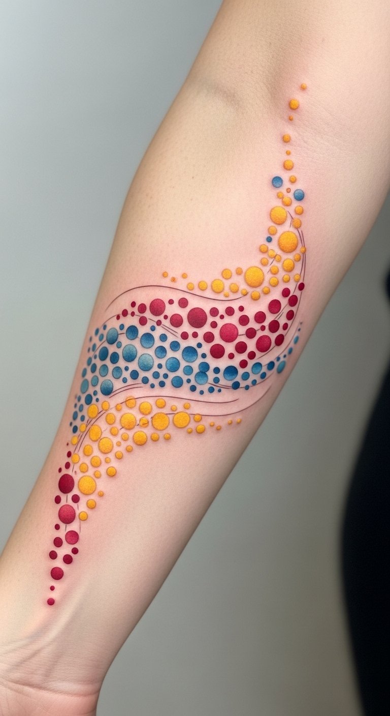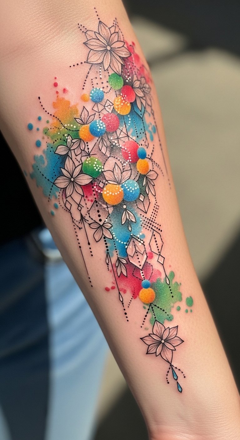 This forearm placement lets the flow mirror the arm’s natural movement, the colors evoke passion, serenity, and joy, and the micro-dot plus watercolor blend suggests both precision and spontaneity—ideal for someone seeking a subtle yet emotionally resonant piece.