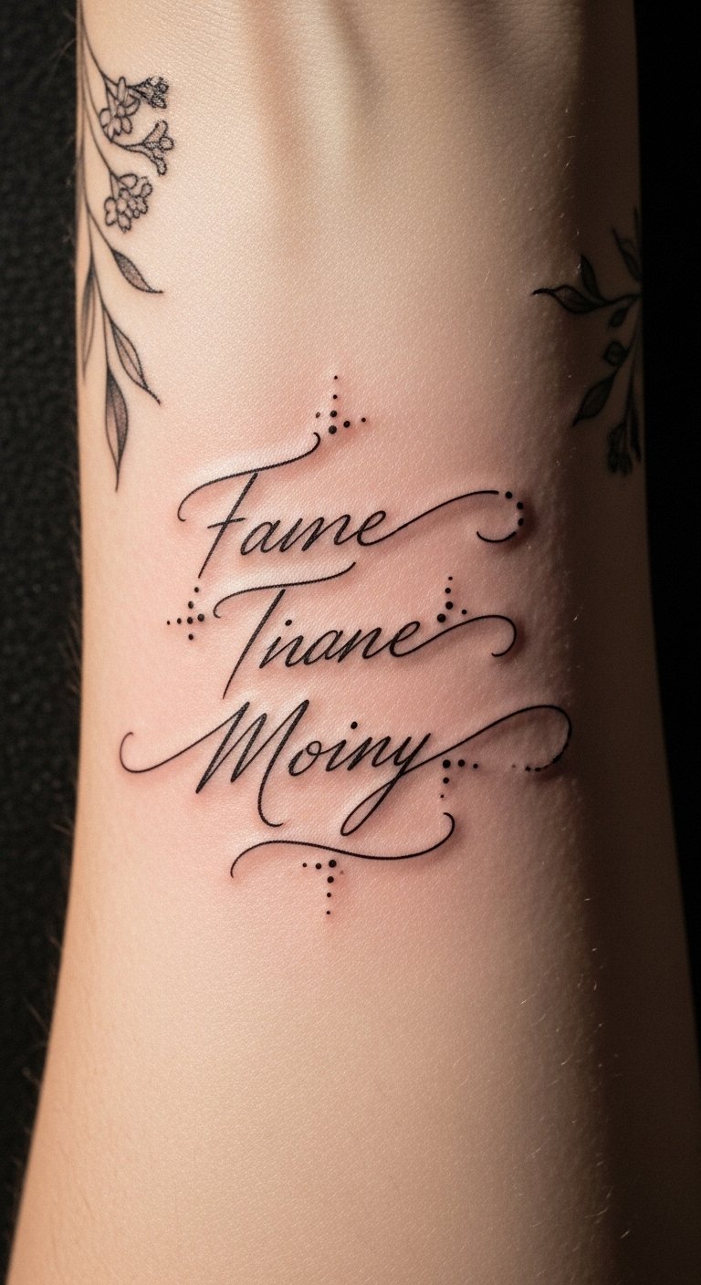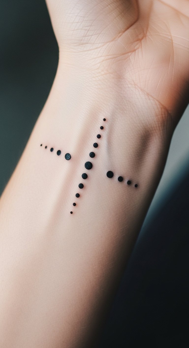 These elegant script styles paired with dot symbolism create a stunning visual contrast, empowering you to showcase your individuality. Each dot can represent a cherished memory, giving depth and meaning to your inked expression, celebrating your unique journey.