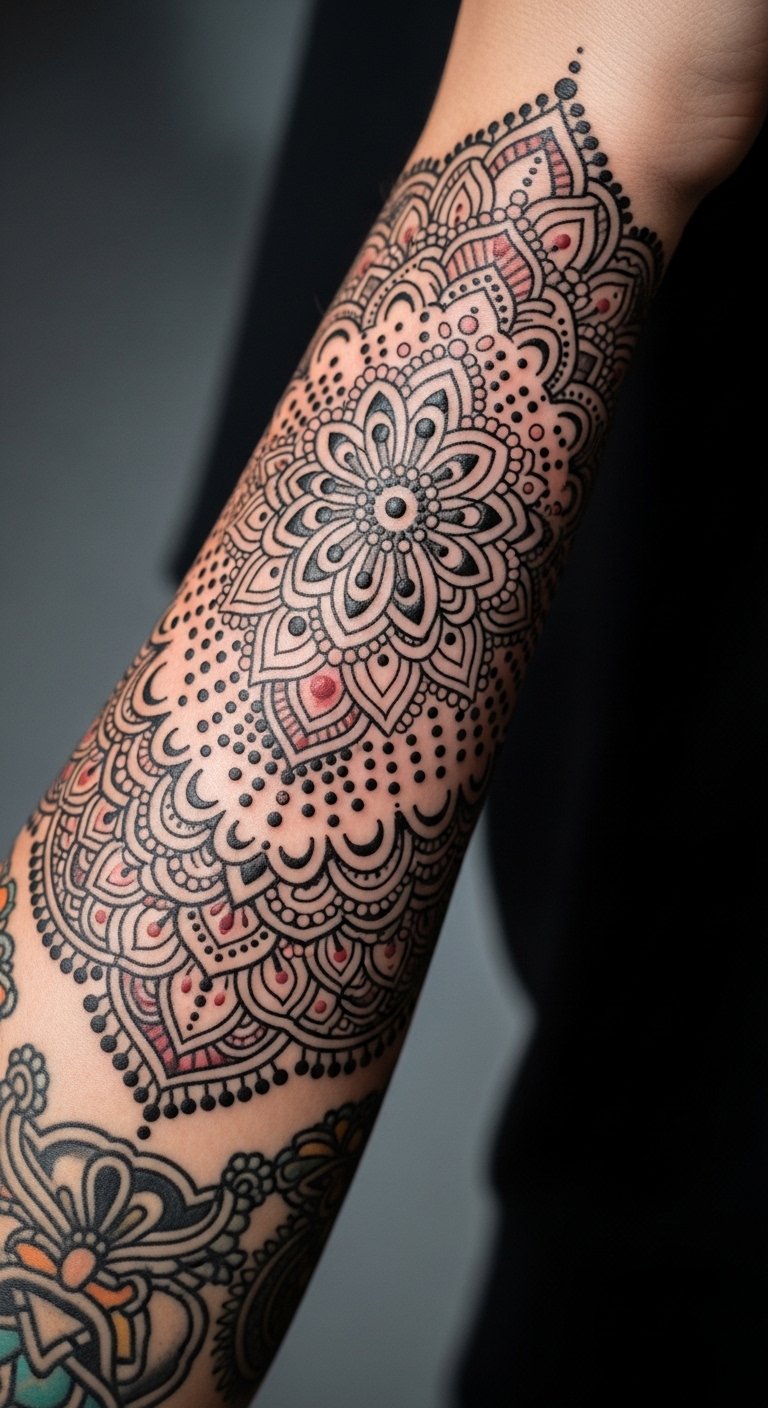 This design concept uses clusters of varied-sized dots woven into filigree, mandala fragments, and tiny geometric motifs that flow with the forearm’s natural lines; dots serve as focal points and connections, suggesting pulses of memory and celebration.