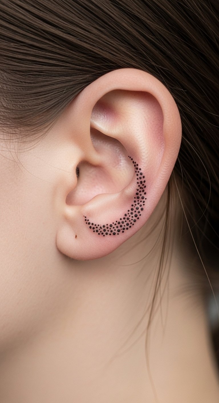 The crescent formed by the dots suggests quiet protection and cyclical growth, while the ear-hugging curve keeps the design discreet—visible primarily to those you choose—inviting curiosity and offering a small, personal emblem of freedom and deeper truths nestled against the skin.