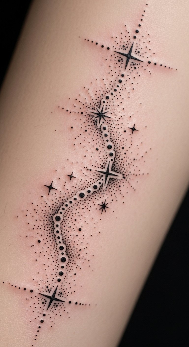 When applied as a tattoo, this design marries minimalist dot-work with fine-line stars to evoke personal growth, wonder, and guidance.