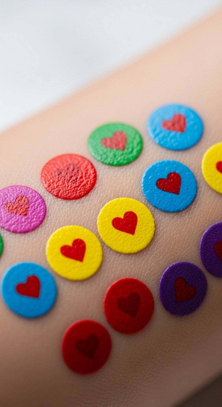 Party dots with heart symbols symbolize bursts of emotion—playful yet intimate—ideal for wrists, ankles, behind the ear, or scattered across a shoulder blade to mimic confetti.