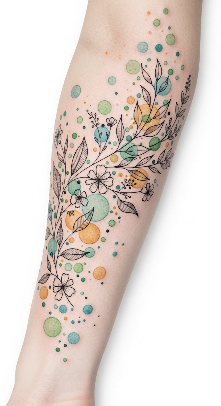 While you’re exploring tattoo designs that resonate with your love for nature, consider the enchanting blend of watercolor dots intertwined with botanical elements.