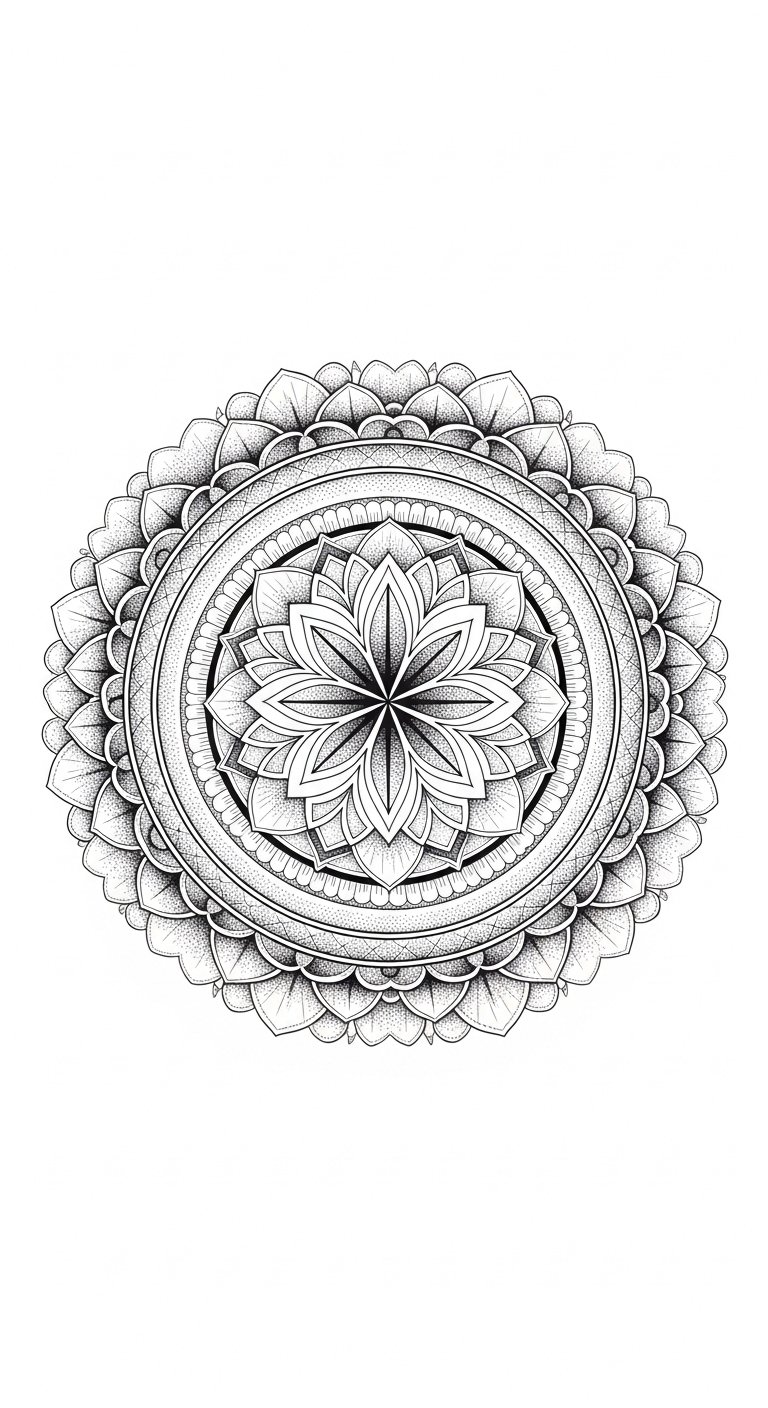 This design symbolizes centeredness and gradual inner growth—the central seed as potential, concentric dots as breath and cycles, and floral geometry as unfolding awareness; it evokes calm, focus, and gentle empowerment.