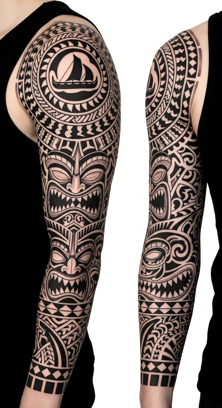 The placement as a half-sleeve wrapping shoulder to elbow allows the canoe and concentric frames to sit over the deltoid as a focal ancestral guide, waves and shark teeth following muscle lines to evoke protection and strength; emotionally it blends reverence, pride, and a sense of passage, honoring heritage while marking personal freedom and life journey.