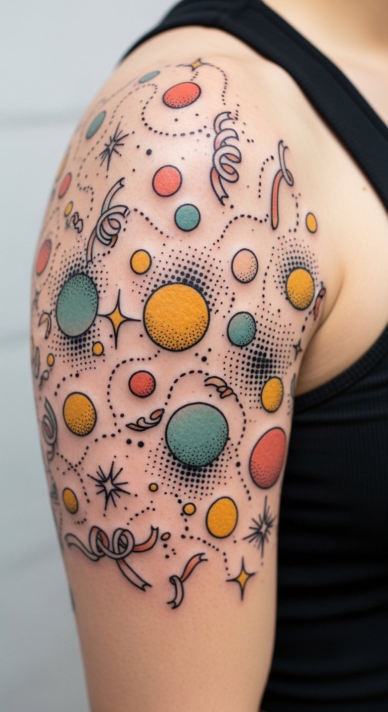 Layered dots can serve as a stunning foundation for vibrant tattoo combinations that capture the energy of celebration and personal expression.