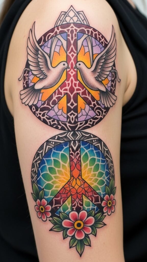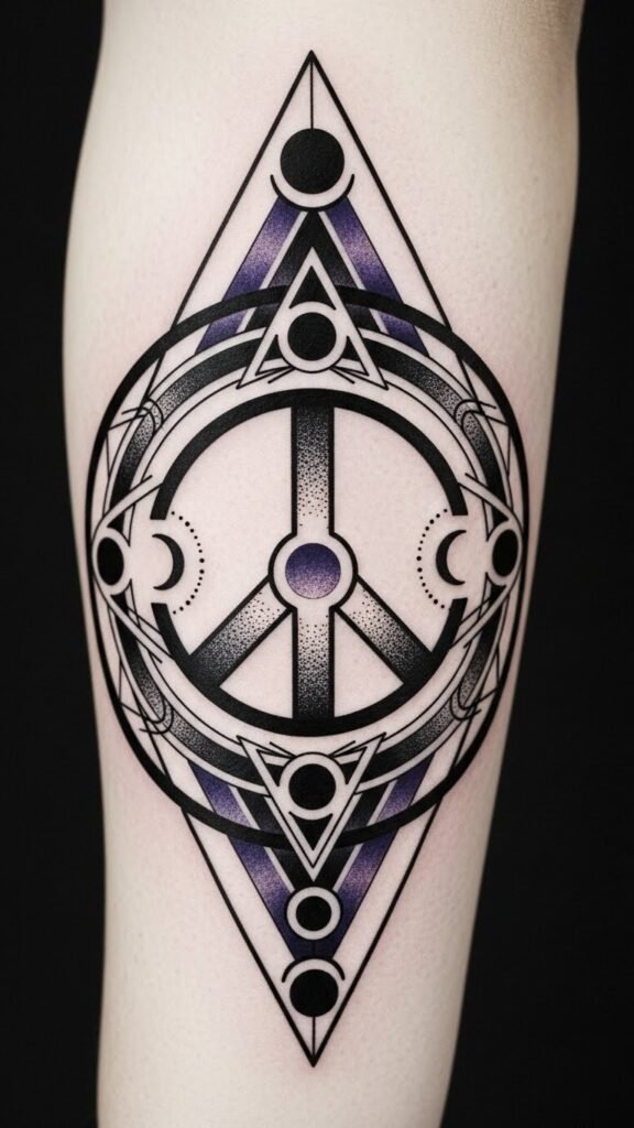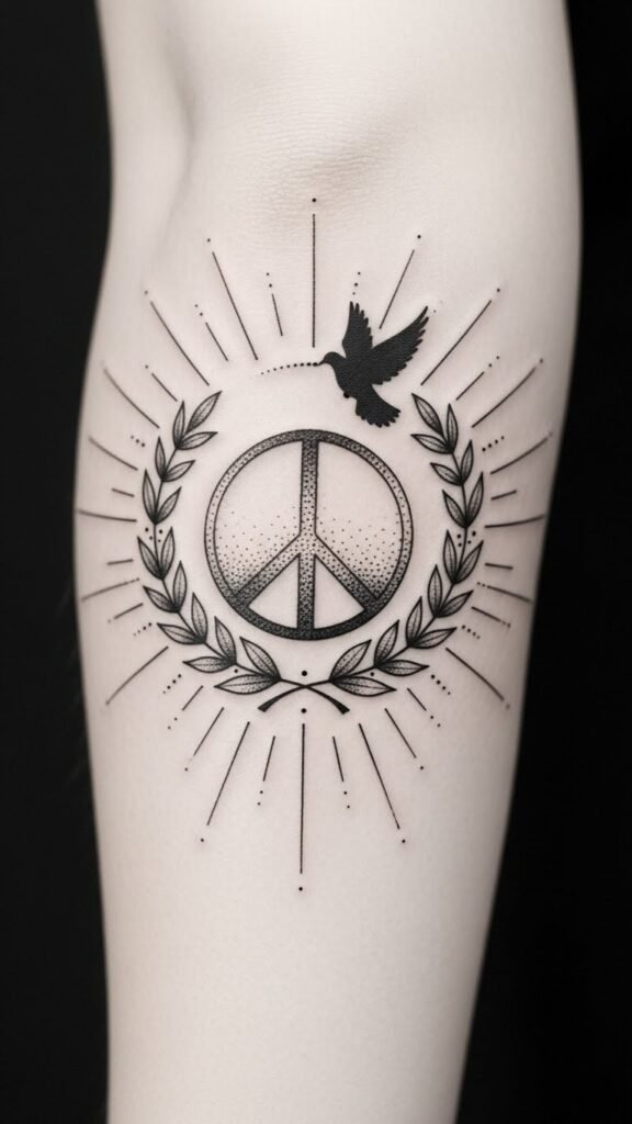 Combine a central peace symbol with a minimalist dove in flight weaving through overlapping geometric patterns and soft botanical elements—delicate olive branches and ferns—with subtle watercolor washes in teal and warm ochre; ideal as a forearm or upper back piece. The symbolism unites universal harmony (the peace sign), freedom and hope (the dove), balance and structure (geometry), and natural calm (flora), evoking peaceful resolve and personal growth; placement on the forearm makes it visible as a daily reminder, while the upper back allows for a larger, more private expression.
