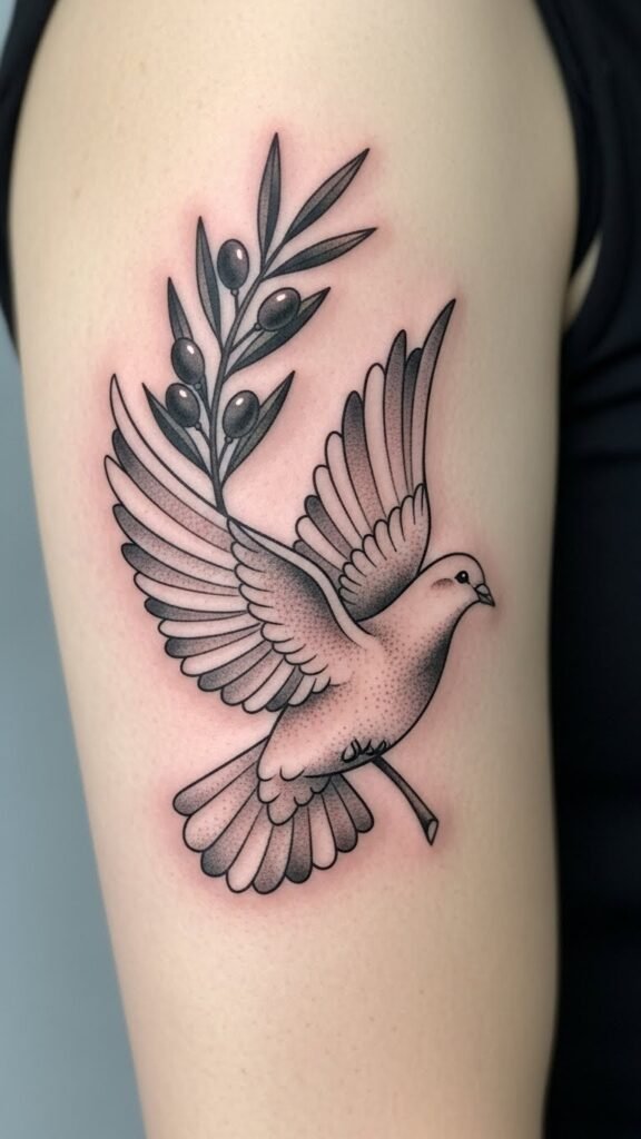 An elegant dove paired with an olive branch serves as a delicate, minimalist tattoo that conveys profound symbolism: the dove evokes hope, purity, and spiritual renewal while the olive branch represents unity, reconciliation, and the cessation of strife.