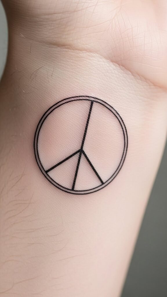 While exploring tattoo options, a minimalist black ink peace symbol stands out as a striking choice that captures the essence of harmony in its simplest form.