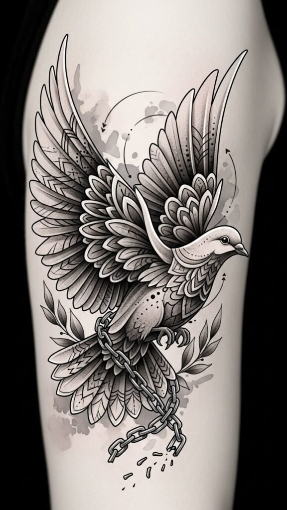 The dove symbolizes peace and the broken chain represents personal liberation; filigree and geometric elements blend tradition with modernity, evoking calm resilience.
