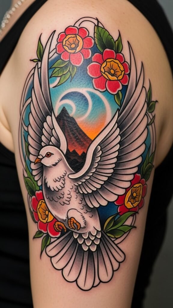 This concept uses bold outlines, rich jewel tones, and layered shading to emphasize the dove’s feathers and graceful motion. Surrounding elements like stylized roses, banners, or subtle rays reinforce themes of peace and hope while adding visual weight for forearm, chest, or shoulder placement.