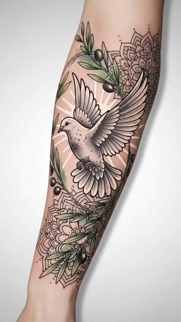 The dove symbolizes spiritual freedom and gentle resilience, olive branches evoke reconciliation and continuity, and mandala elements center the design emotionally—calming focus around the forearm’s natural line; together they create a wearable reminder of unity and quiet strength, visible yet intimate depending on placement and scale.