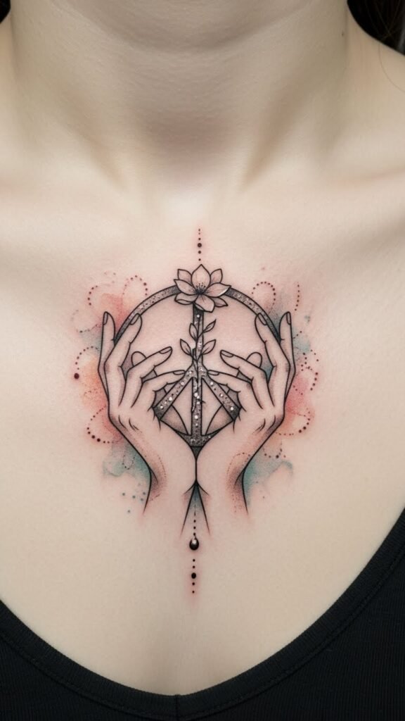 Whether in minimalist ink or vibrant colors, your tattoo becomes a canvas for freedom, expressing your desire for peace and connection in a world that often feels chaotic. The design’s interlocking hands and central flower symbolize personal compassion and growth; the warm watercolor tones evoke tenderness while the placement over the sternum keeps the message close to the heart, conveying vulnerability, resilience, and a quiet commitment to harmony.