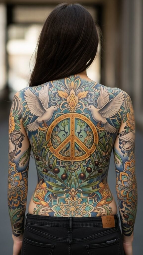 This design places larger mandalas along the spine, radiating outward into layered olive branches that curve across the shoulder blades, while doves in mid-flight arc toward the lower ribcage and upper back — together creating movement and balance.