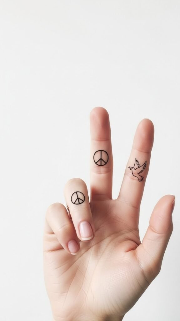 Delicate linework and micro-detail emphasize calm and intention: a minimalist peace symbol on the index finger, a tiny flying dove on the side of the ring finger, soft dotwork halo, fine ornamental filigree connecting the two with negative space; monochrome or light pastel inks for subtlety, 3–4 mm scale to sit comfortably between knuckles or along the finger edge, designed to age gracefully and remain discreet—symbolizing nonviolence, inner peace, and gentle resilience, evoking serenity when viewed or covered depending on the moment.