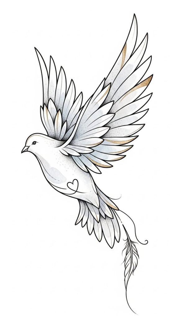 This design uses a small, graceful dove rendered in thin, flowing lines with soft curve accents and minimal shading to evoke serenity; the bird’s wings curl gently around a tiny olive sprig, suggesting protection and hope, while negative space keeps the image airy and light.