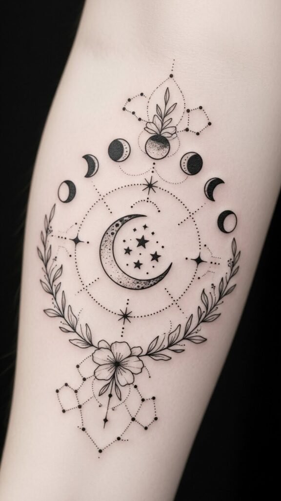 The crescent-and-stars motif evokes gentle protection and guidance; the orbit lines and phase progression symbolize cycles, balance, and personal growth. Fine-line and dotwork create an intimate, calming aesthetic that reads well on the wrist or inner forearm, allowing frequent visibility for grounding and mindful reflection.