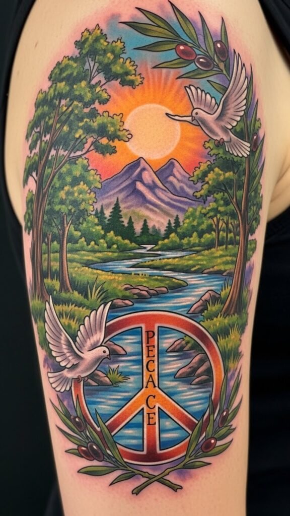 This tattoo concept blends nature and classic peace symbols to evoke calm and unity: flowing lines form a winding stream through a small grove of detailed trees, with a perched dove holding an olive branch above; soft shading and subtle color in greens, blues, and warm neutrals create a soothing, meditative feel.
