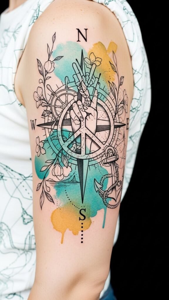 A compass tattoo beautifully symbolizes guidance and direction, making it a perfect companion to the iconic peace motifs.