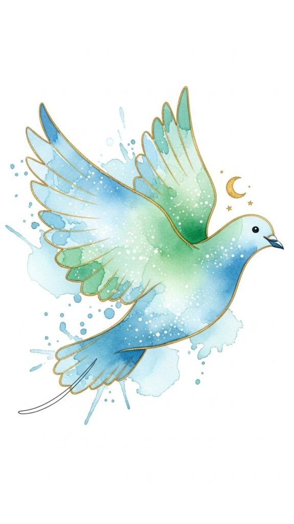 This design uses the dove as a universal peace symbol rendered in calming blue and green watercolors to evoke serenity and renewal; the gold linework adds warmth and a sense of preciousness, while the moon and stars suggest hope and guidance.