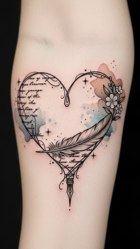 Watercolor washes suggest the fluidity of memory and emotion, while the heart silhouette keeps the overall design intimate and centered—ideal for a forearm or rib where it can be both private and visible when chosen.
