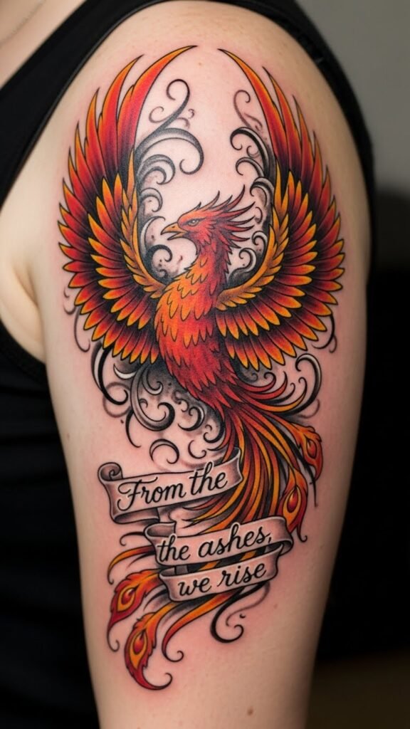 While you contemplate the perfect tattoo, envision a phoenix soaring above a powerful quote on resilience.
