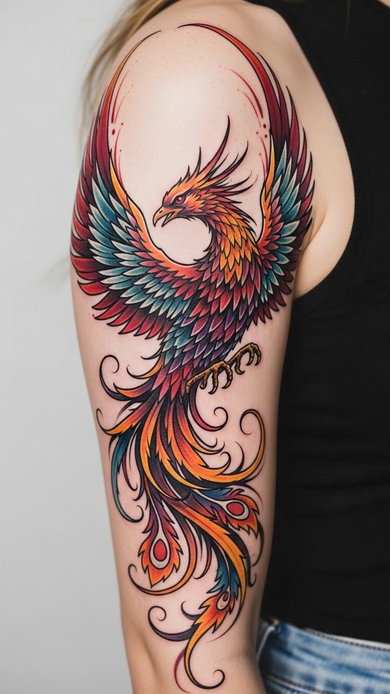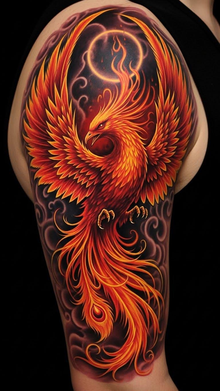 As you place this design on the body, think of the phoenix arching upward along the shoulder blade or wrapping around the forearm, flames and ash flowing with natural muscle lines to emphasize movement and renewal; the vibrant colors—deep crimsons, molten oranges, gold highlights, and cool ash-gray—convey intense emotion: defiance, healing, and the quiet strength after struggle.
