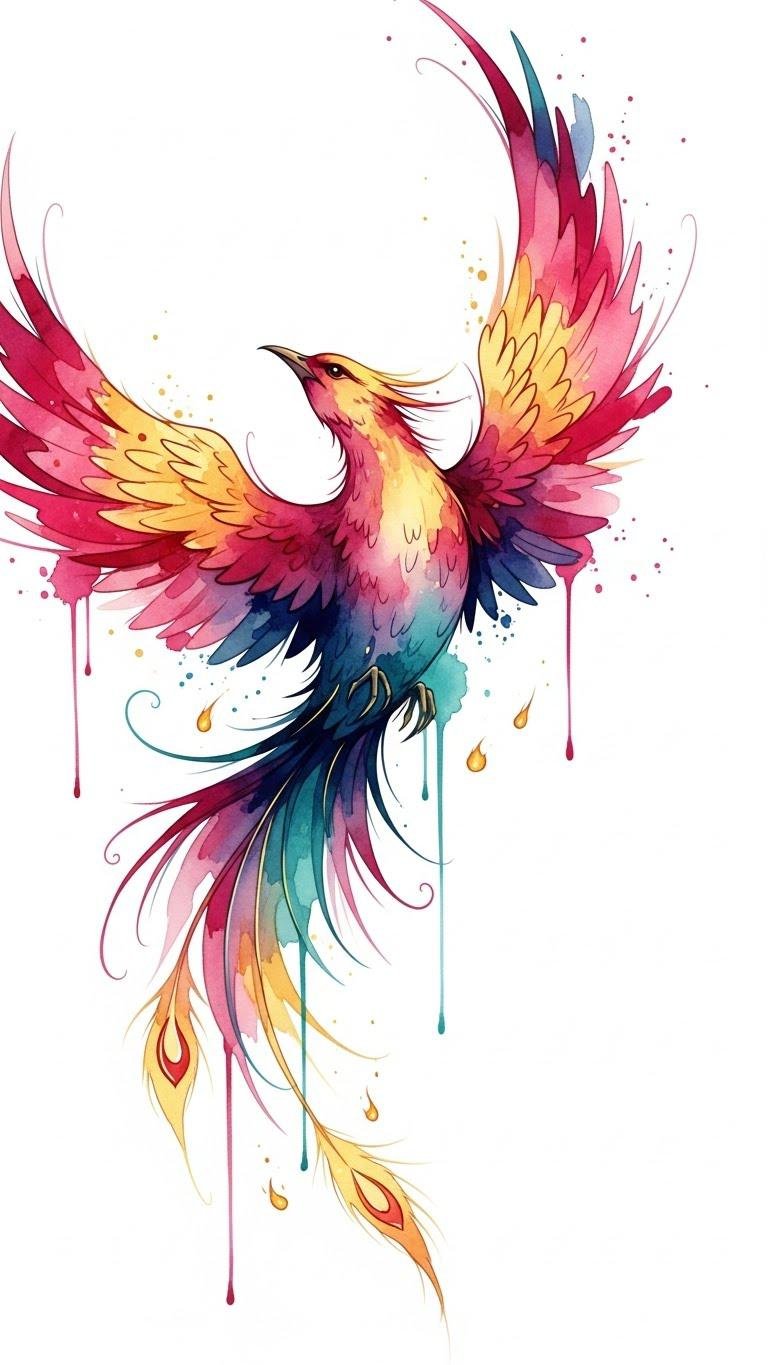 Using elegant watercolor techniques and color blending strategies, this tattoo captures the spirit of transformation. Each stroke whispers freedom, inviting you to embrace your journey and rise anew, like the phoenix igniting your soul with vibrant possibilities.