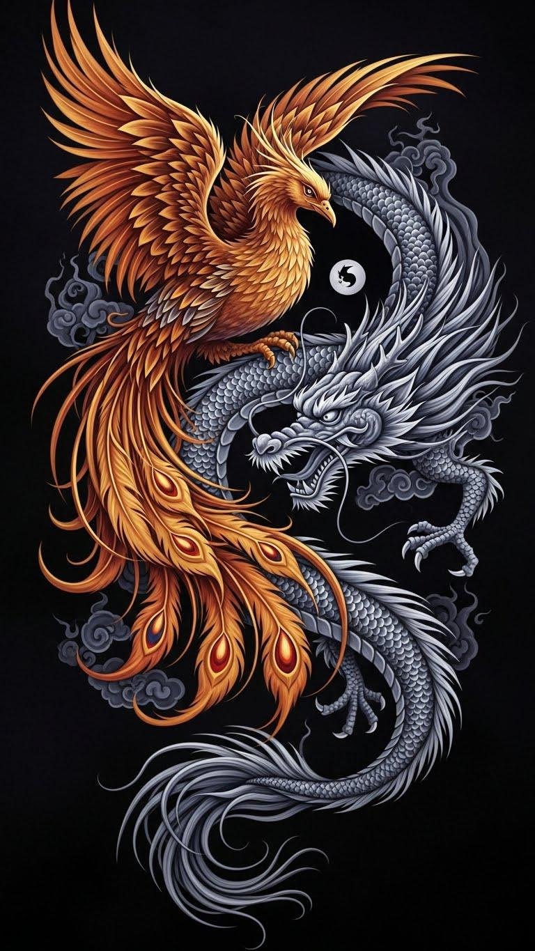 A flowing back-piece design where the dragon coils upward along the spine in dark, scaled detail while the phoenix rises opposite in radiant, ephemeral plumage, their bodies forming an interlocking yin-yang circle; include subtle flames and wind motifs, delicate linework for feathers and scales, and negative space for breath and movement. Symbolically this represents rebirth and power in equilibrium, evoking resilience, transformation, and inner harmony; emotionally it can feel both fierce and uplifting. Ideal placements: full back, chest-to-shoulder sash, or a wrap-around thigh for dramatic movement.