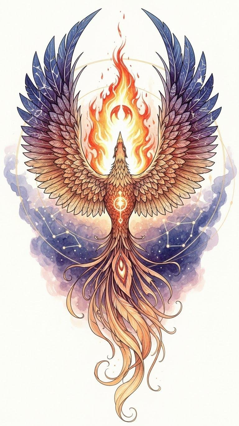 Imagine a design infused with cosmic rebirth and astral beauty, where the Phoenix rises under a starlit aura, embodying spiritual alignment and universe integration. This mythical inspiration creates a breathtaking tapestry of heavenly transformation, radiating ethereal beauty that ignites your spirit.