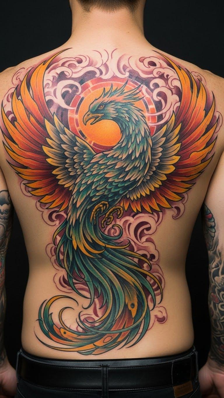 The emotional core emphasizes transformation and strength, placed centrally with the head near the upper spine and tail feathers cascading toward the lower back to follow the body’s natural lines, creating both a bold visual statement and a deeply personal talisman of survival and renewal.