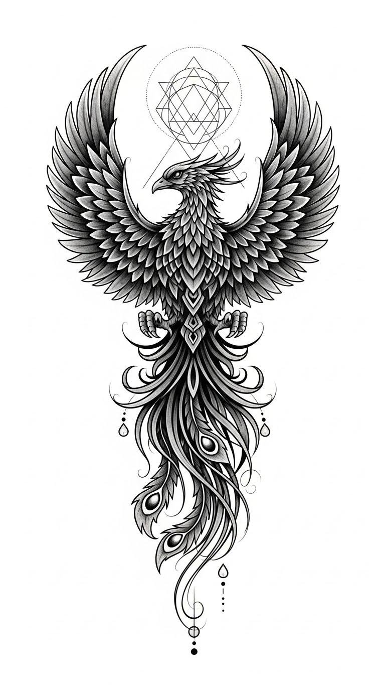 Embracing this design as a tattoo conveys transformation, resilience, and a carefully ordered rebirth through the phoenix’s flowing lines and interlocking geometric motifs; place it along the upper back or wrapping from shoulder to chest to allow the wings and patterns to follow natural musculature, or scale it down for an inner forearm or calf for a personal reminder of renewal.