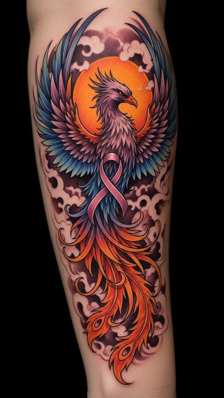 Incorporate layered symbols — a phoenix rising with feathers subtly composed of personal icons (birth flowers, initials, small constellations) and color gradients tied to emotional milestones — to convey rebirth and continuity; place it where movement and visibility reinforce meaning (shoulder blade or ribcage for intimate strength, forearm or chest for daily affirmation). Work with your artist to balance cultural motifs and private elements so the tattoo communicates resilience, the trajectory of your journey, and a personalized visual language that evokes both empowerment and quiet remembrance.