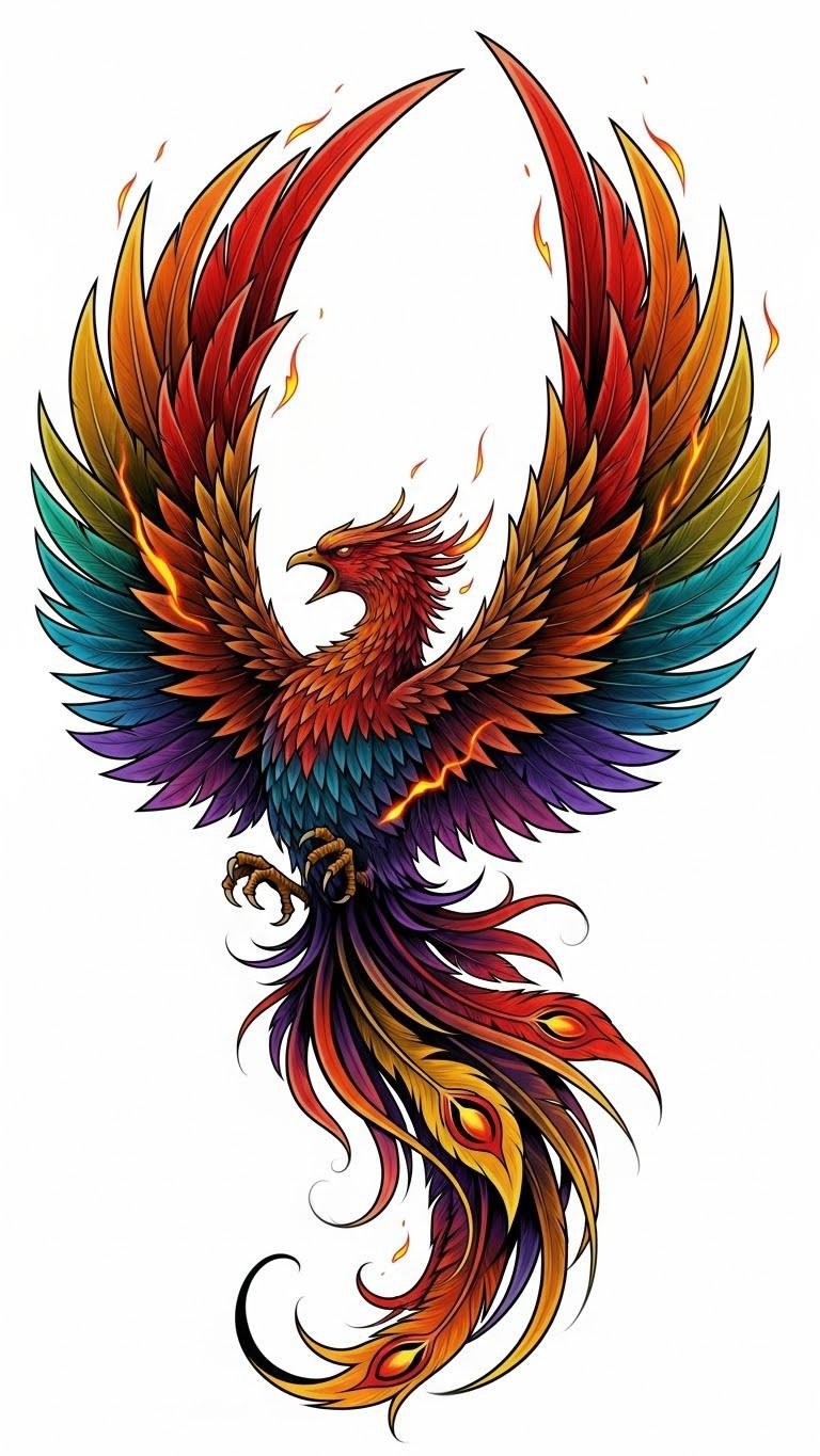 This concept blends vibrant, flowing lines and fragmented geometric shapes to symbolize rebirth and resilience; colors transition from deep crimson at the core to gold and teal at the wingtips to evoke warmth and renewal. Emotionally it channels empowerment and renewal, a visual reminder of rising after hardship; culturally it nods to mythic roots while keeping a modern, artistic tone. Ideal placements include the upper back or sternum for a central, powerful statement, the forearm or calf for a vertical spread, or wrapped around the shoulder to emphasize motion and flight.