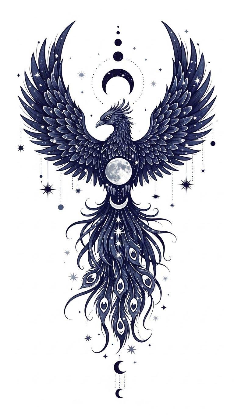 This tattoo blends celestial motifs with the phoenix’s flowing plumage to evoke renewal, inner strength, and a connection to the cosmos; place along the upper back or ribcage to allow the wings to spread naturally, or curve it around the shoulder and collarbone for a more intimate, visible reminder of resilience and freedom.